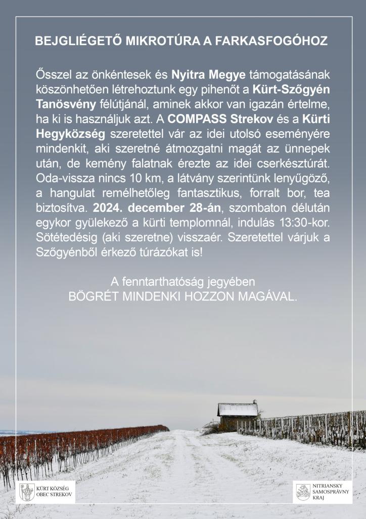 Ősszel az önkéntesek (és Nyitra megye) segítségével létrehoztunk egy pihenőt a Kürt-Szőgyén Tanösvény félútjánál, aminek akkor van igazán értelme, ha ki is használjuk azt. Ajánljuk mindenkinek, aki szeretné átmozgatni magát az ünnepek után, de kemény falatnak érezte a cserkésztúrát. Oda-vissza nincs 10 km, a látvány szerintünk lenyűgöző, a hangulat remélhetőleg fantasztikus, forralt bor, tea biztosítva. Egytől gyülekező a kürti templomnál, indulás 13:30-kor. Sötétedésig (aki akar) visszaér. Szeretettel várjuk a Szőgyénből érkező túrázókat is! A fenntarthatóság jegyében BÖGRÉT MINDENKI HOZZON MAGÁVAL.